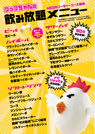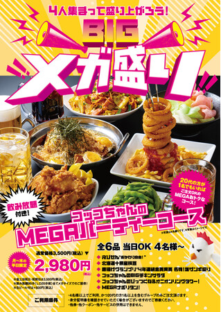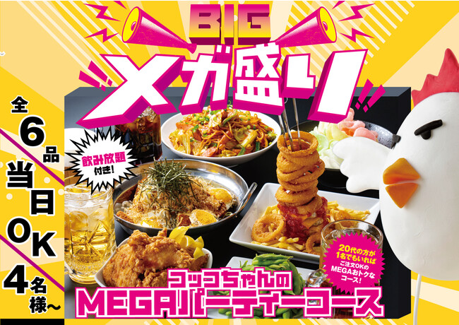 ■北海道焼鳥いただきコッコちゃんが、初めての20代に向けたボリューム満点飲み放題付きパーティーコース「MEGA(メガ)パーティーコース」を2023年3月13日(月)~5月7日(日)の期間限定で販売。■パーティーコースは全6品・当日OK・4名様から飲み放題付き2980円(税込)(月~木曜日の平日限定価格/金・土・日・祝日・祝前日は3500円(税込))※飲み放題の生ビール付きはプラス500円(税込)■2023年3月13日(月)からマスク着用を個人の判断が基本とする政府の考え方の見直し、卒業・入学など春に向けて人が集まる機会が増えるこの時期に、楽しくお腹いっぱい食事を楽しんでいただきたいという想いから20代へ向けたパーティーコースの販売が決まりました。■高さに驚きの「びっつくね&オニオンリングタワー!」や、通常の約4倍の「MEGAナポリタン!」、鍋に山盛りの「BIGチキンサラダ」など全6品。飲み放題のドリンクは全てメガジョッキでの提供。