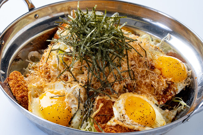 テーブルに運ばれた「お鍋」に入っているのはボリューム満点のチキンサラダ!野菜もしっかり摂取してほしいという想いから、山盛りのキャベツの千切りにチキンカツ、目玉焼きに鰹節と海苔が乗ったサラダマウンテンがそびえたつ!豪快に混ぜて食べるのがオススメ!