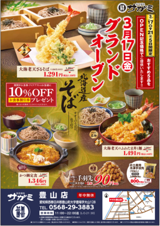 この度、和食麺処サガミを展開するサガミレストランツ株式会社(本社:名古屋市守山区八剣2丁目118番地 代表取締役社長 鷲津 年春)は、2023年3月17日(金)に『和食麺処サガミ豊山店』(愛知県西春日井郡豊山町)をグランドオープンいたします。オープン記念企画として2023年3月17日(金)より3月21日(祝)の5日間おすすめ5品を記念価格でご提供いたします。また期間中ご来店のお客様に「10%OFFお食事割引券」を進呈いたします。