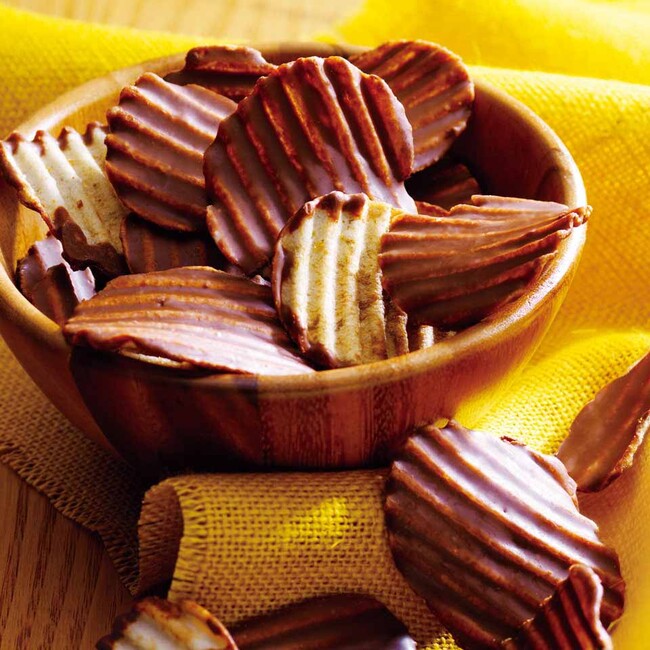 ポテトチップとチョコレート、意外な組み合わせから生まれた大ヒットのおいしさ。 パリッとした軽快な食感のポテトチップの片面に、口どけの良いチョコレートをコーティングしました。 チョコレートの甘さとポテトチップの塩味が織りなすハーモニーをお楽しみください。