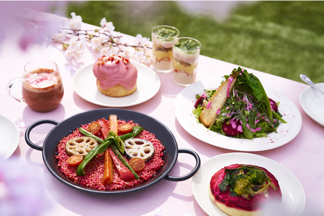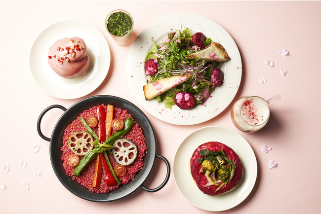 旬の春野菜をたっぷりと使用した100%プラントベース(植物性)のコースメニューです。彩り鮮やかなオーガニックのビーツを主役に、細部までシェフのこだわりがつまった一品が集まりました。昨年大好評だったミニパフェは、いちごやオーガニックの抹茶を加え、春らしいデザートに仕上げました。ソースやドレッシングもすべて手作りしております。コースメニューご注文の方は、桜が一望できるテラス席にご案内いたします。※店内飲食不可 ※特設Webフォームより予約必須