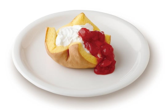 「モスバーガー&カフェ」オリジナルの新感覚スイーツです。北海道産の生クリームを配合したコクのある口どけの良いクリームを、卵の風味が強いしっとりした食感のスポンジで包みました。いちご果肉を80%配合し、果肉感にこだわったストロベリーソースをかけてお召し上がりいただくことで、まるでいちごのショートケーキのような味わいをお楽しみいただけます。商品名は、丸くかわいらしい形状となめらかな食感をイメージし、クリームポムと名付けました。