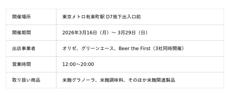 日本の伝統発酵技術を用いて社会課題解決を目指す株式会社オリゼ(本社:東京都渋谷区、代表取締役:小泉泰英)は、フードテック官民協議会アップサイクルフードワーキングチーム(以下「アップサイクルフードWT」)が主催する「アップサイクルフードマルシェ」に出店事業者として参画し、2026年3月16日(月)から3月29日(日)まで、東京メトロ有楽町駅にてオリゼ独自の米麹発酵技術を活かした商品を販売いたします。なお、当マルシェの運営には東京メトログループ・株式会社三菱UFJ銀行が協力しています。