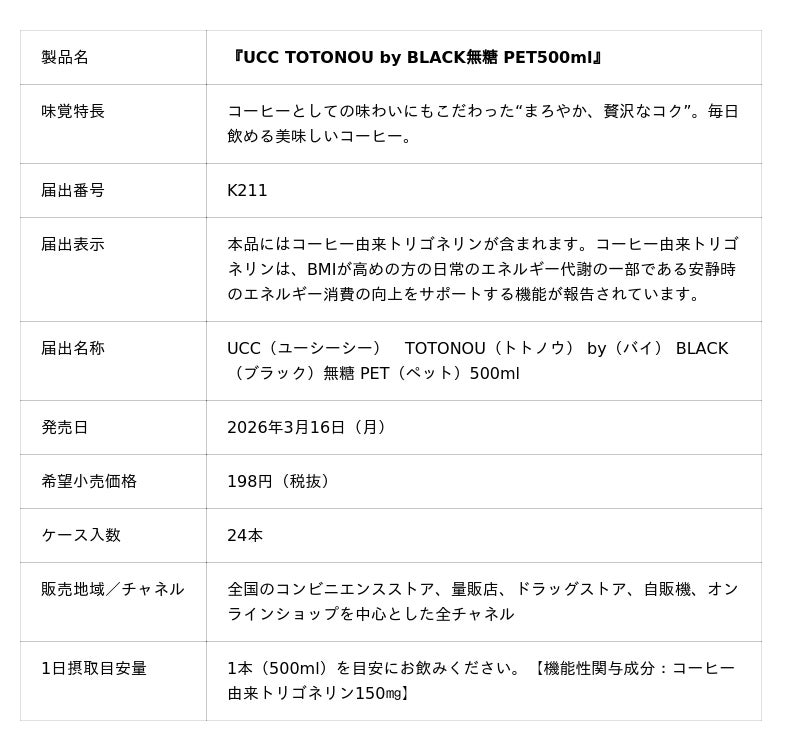 UCC上島珈琲株式会社(本社/兵庫県神戸市、資本金/1億円、社長/芝谷博司、以下UCC)は、コーヒーで自分をととのえる“コンディショニングコーヒー”をコンセプトとした製品『UCC TOTONOU by BLACK無糖 PET500ml』を3月16日(月)に新発売します。本製品は、「コーヒー由来トリゴネリン」により、BMIが高めの方の安静時のエネルギー消費※2の向上をサポートする機能性表示食品で、本機能として日本初のPETコーヒー※3です。「BLACK無糖」ブランドのアイデンティティを踏襲し、原材料はコーヒーのみ※4、機能性関与成分であるトリゴネリンはコーヒー由来、香料も添加していません。UCCは、コーヒーで代謝をケアする新習慣を提案します。