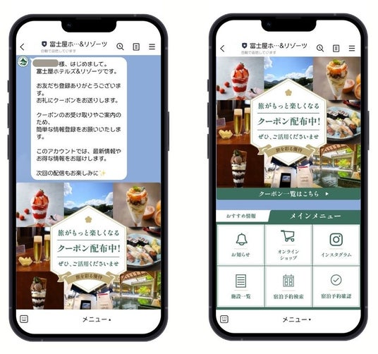 本アカウントの開設により、お客様のさらなる利便性向上を図るとともに、季節のご案内やキャンペーン情報、お得なクーポンなど、富士屋ホテルズ&リゾーツをより身近に感じていただける情報を、LINEを通じてお届けいたします。また、LINE公式アカウントからは、各ホテル・施設のホームページやご予約ページへも簡単にアクセスすることができます。ぜひ友だち追加をしてご利用ください。