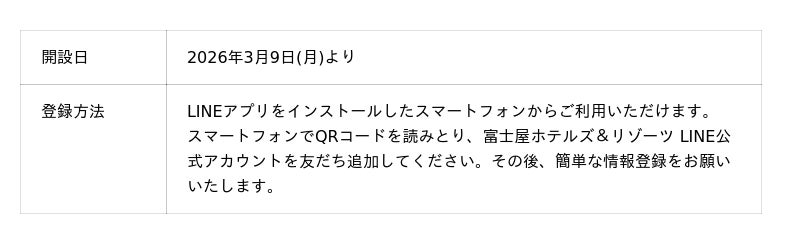国際興業グループの富士屋ホテル株式会社(本社:神奈川県足柄下郡箱根町宮ノ下359/代表取締役 社長 安藤 昭)では、コミュニケーションアプリ「LINE」にて「富士屋ホテルズ&リゾーツ LINE公式アカウント」を2026年3月9日(月)より開設いたしました。