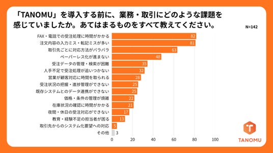 卸業者がデジタル化サービス(「TANOMU」)の導入前に感じていた課題は、「FAX・電話での受注処理に時間がかかる」81.7%、「注文内容の入力ミス・転記ミスが多い」81.0%と、アナログ受注に起因する工数増大とヒューマンエラーが突出しています。