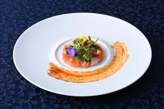 広島サーモンとくれぇ海老の山から注がれる川のイメージ 甲殻類のヴィネグレットで宮島に沈む夕日を(イメージ)