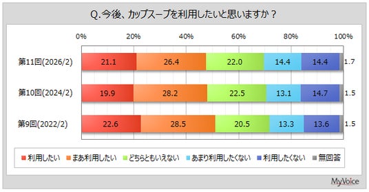 マイボイスコム株式会社(東京都千代田区、代表取締役社長:高井和久)は、11回目となる『カップスープの利用』に関するインターネット調査を2026年2月1日~7日に実施しました。