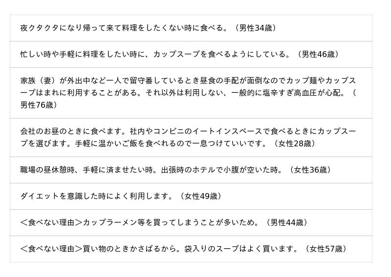 カップスープを食べる人に、食べる場面や理由を聞きました。