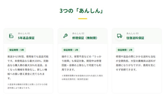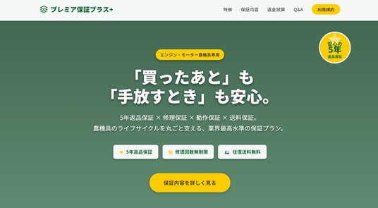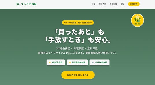 株式会社GROWLAND(本社:和歌山県日高郡みなべ町)(以下:グローランド)が運営する農業機械通販サイト「アグリズ」は、独自の保証サービス「プレミア保証」「プレミア保証プラス」をリニューアルし、返品保証期間を5年へ延長しました。本サービスでは、農業機械を実際に使用した後でも返品が可能(※条件により返金額は変動)となっており、農業機械導入時の不安を軽減する仕組みを提供しています。農業機械は高額な設備である一方、実際の作業環境に合うかどうかは使用してみないと分からないケースもあります。アグリズでは返品保証を拡充することで、農業機械を安心して導入できる環境づくりを進めています。