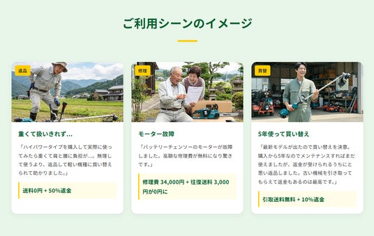 主にバッテリータイプの農業機械を対象とした保証サービスです。バッテリー機械はエンジン機械と比較して構造がシンプルで、出荷前の試運転が不要なため、製品チェックを行ったうえで出荷しています。