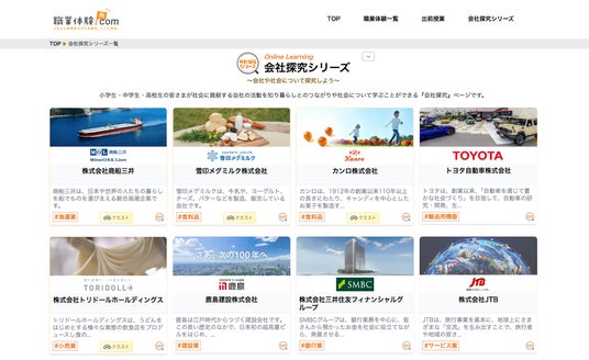 「会社探究シリーズ」は、小学生・中学生・高校生が、社会を支える企業の活動を知り、暮らしとのつながりや社会の仕組みについて楽しく、わかりやすく学べるWeb情報教材です。日本のくらしと未来を支える企業の業種、事業内容、職種、サステナビリティの取り組みなどの情報をまとめ、日本全国の小学校・中学校・高等学校の授業向けに提供しています。