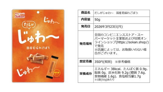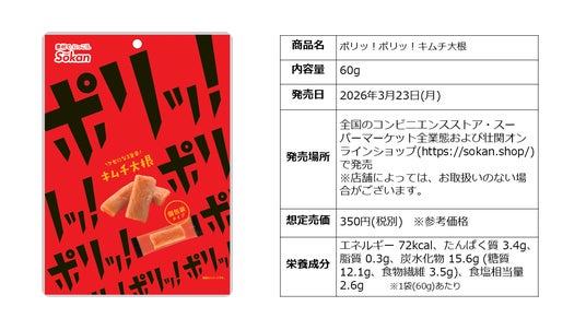 株式会社壮関(本社:栃木県矢板市 代表取締役社長:板山 健一)は、新商品『ポリッ!ポリッ!キムチ大根/だしがじゅわ~ 国産若採れごぼう』を2026年3月23日(月)より全国のコンビニエンスストア・スーパーマーケット全業態および壮関オンラインショップ(https://sokan.shop/)で発売いたします。