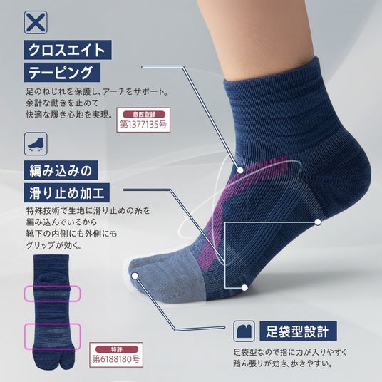 毎日のウォーキングをもっと快適に!疲れにくい歩き方をサポートする靴下。足袋型形状により指に力が入りやすく、踏ん張りが効きます。「クロスエイトテーピング」が足のねじれを保護し、アーチをサポート。編み込みの滑り止め加工で内側・外側ともにグリップが効き、歩行中もズレにくい設計です。ヒールロック設計でかかとをしっかりホールド。つま先・かかとはパイル編みでクッション性をプラスして衝撃を緩和。抗菌防臭・消臭・吸水速乾で、ムレやすい足もとを快適に保ちます。
