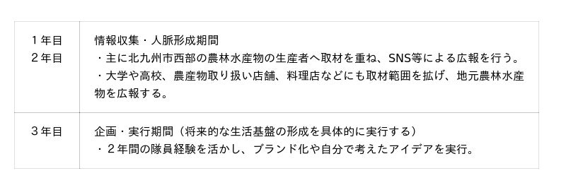 そのような若松北海岸エリアにおいて、北九州市の農林水産物の広報を通じて、農業、水産業、畜産業、林業の幅広い知識を形成し、また農家や漁師などの農林水産関係者と人脈を形成することで、3年間の活動後の生活基盤(起業:店舗オープンなど)を検討しながら活動を行い、地域への定住、定着を図るものです。