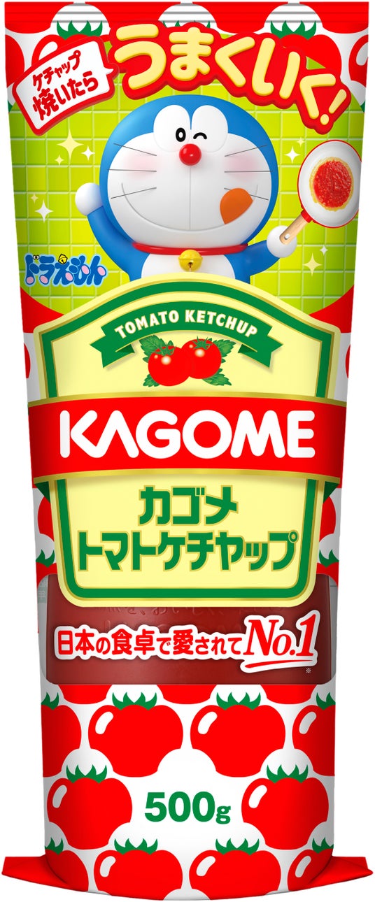 「ドラえもん」オリジナルパッケージ商品が期間限定で販売予定 フライパン片手にポーズを決めるデザインのドラえもんが可愛らしいオリジナルパッケージの「カゴメトマトケチャップ(500g)」を4月中旬頃より数量限定で順次、全国のスーパー、小売店などで販売予定です。