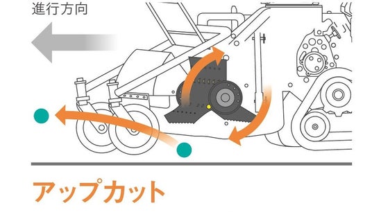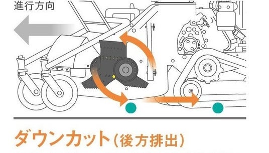 ロータリー正逆切替機構はナイフドラムの回転方向を切り替える機構です。草を細かく粉砕し、刈跡を綺麗に仕上げたいときは、アップカット、飛び石など前方への飛散を抑えたいときはダウンカットと、作業状況や目的に合わせて回転方向を切り替えることが可能です。