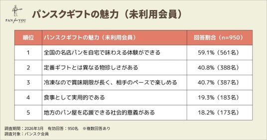 パンスクギフトを利用したことがないパンスク会員950名に対し、「全国各地のパン屋から冷凍パンが届くギフト」としてパンスクギフトを紹介したところ、「とても興味がある」(29.6%)と「やや興味がある」(41.4%)を合わせた70.9%(674名)が肯定的な反応を示しました。また、最も魅力を感じる点として「全国の名店パンを自宅で味わえる体験ができる」(59.1%)が首位となり、体験型消費へのニーズの高さが確認されました。