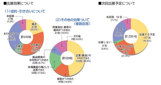 出品者アンケートでは、55.8%が商談実績に「満足・やや満足」と回答しており、モバックショウが商談実績の高い展示会として評価されていることを裏付けています。また、次回出展についても、「出展予定」107社(45.9%)、「出展の方向で検討」51社(21.9%)となり、従来どおり高い支持をいただいております。