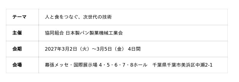 協同組合 日本製パン製菓機械工業会(所在地:東京都中央区、理事長:梶原秀浩)が主催する、製パン製菓産業の未来を展望する国内最大・アジア唯一のビジネスショウ「2027モバックショウ(第30回国際製パン製菓関連産業展)」は、2027年3月2日(火)から5日(金)までの4日間、幕張メッセ(千葉県千葉市)にて開催されます。