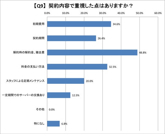 契約内容で重視した点では、「解約時の解約金・撤去費」48.8%と半分近い方が解約金や撤去費を重視しており、次いで「初期費用」が34.6%、「料金の支払い方法」が32.5%と高い割合となりました。