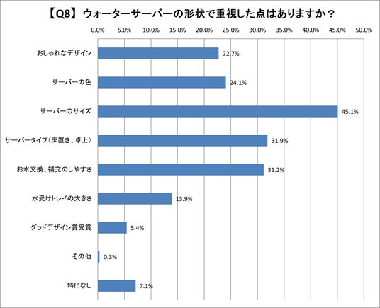 「ウォーターサーバーのサイズ」が45.1%と最も多く、次いで「サーバータイプ(床置き、卓上)」が31.9%、「お水の交換、補充のしやすさと」が31.2%と多くなっています。
