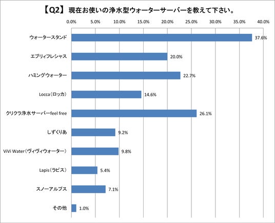 現在利用中の浄水型ウォーターサーバーでは、ウォータースタンドが37.6%と最も多く、次いでクリクラ浄水サーバーが26.1%、ハミングウォーターが22.7%、エブリィフレシャスが20%となっています。