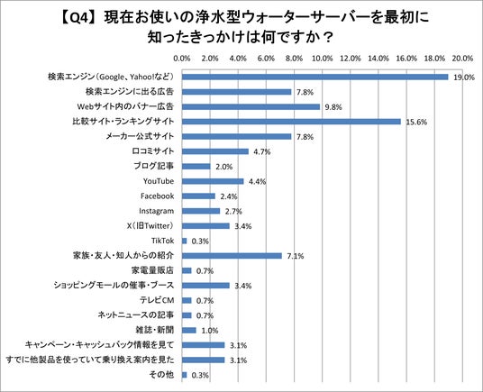 現在利用中の浄水型サーバーを最初に知ったきっかけでは、「検索エンジン」や「比較サイト」などを利用して認知している傾向が見られます。