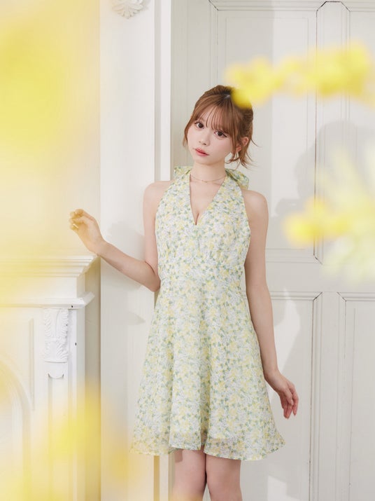 繊細なミモザプリントが華やかさと落ち着きを演出する、軽やかな素材感のワンピース。ホルターネック×背中開きのヘルシーなデザインとウエストギャザーでスタイルアップを叶え、リゾートやホカンス、旅行先にも映える特別感のある一着です。