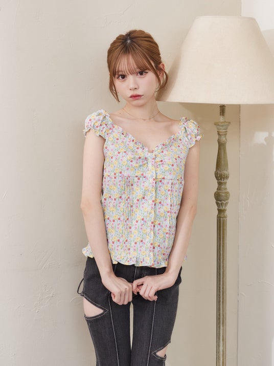 小さなチューリッププリントが華やかに映える、フェミニンムードあふれるブラウス。スタンドカラーや肩のフリル、さりげない肌見せが上品さと抜け感を演出し、スカートにもパンツにも合わせやすい万能な一枚です。