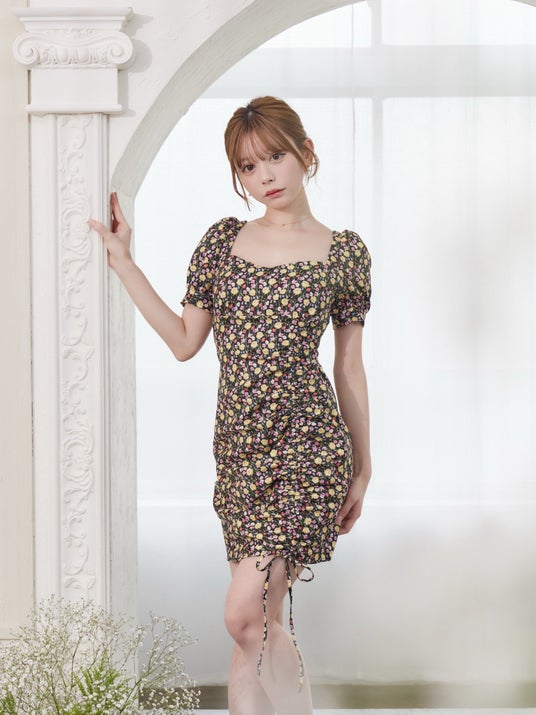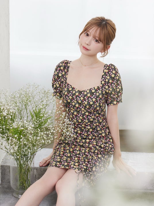 やわらかなタッチで描かれた芍薬プリントが華やかに映える、女性らしさあふれるワンピース。スクエアネックとパフスリーブが美しいデコルテを演出し、サイドのギャザー&ドローストリングでスタイルアップも叶える、甘さと品を兼ね備えた一着です。
