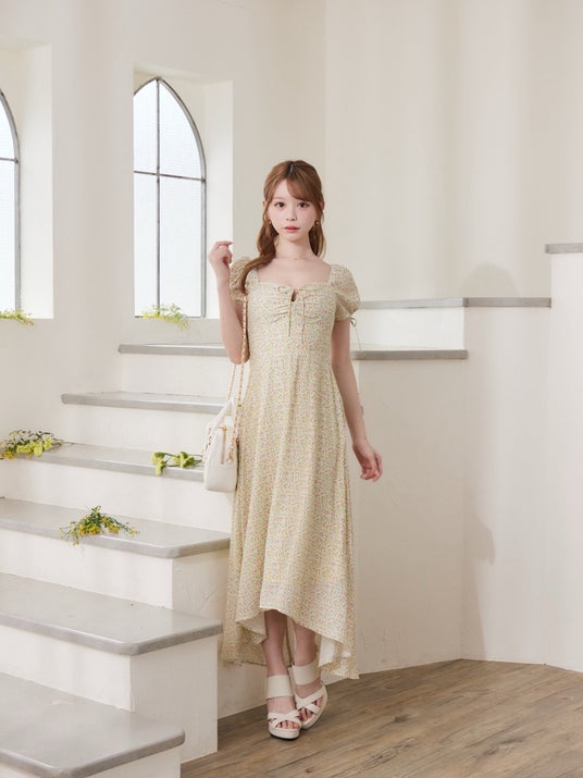 小さなチューリッププリントが上品に映える、甘さ控えめのフェミニンワンピース。スクエアネックとパフスリーブ、リボンディテールが女性らしさを引き立て、動きのあるヘムラインが軽やかな印象を添える一枚です。