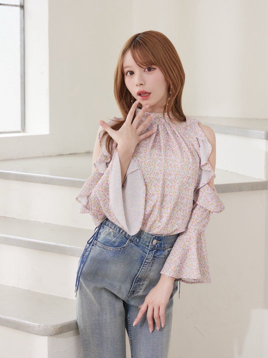 【日比谷花壇コラホ゛】フリルオープンショルタ゛ーフラワーフ゛ラウス