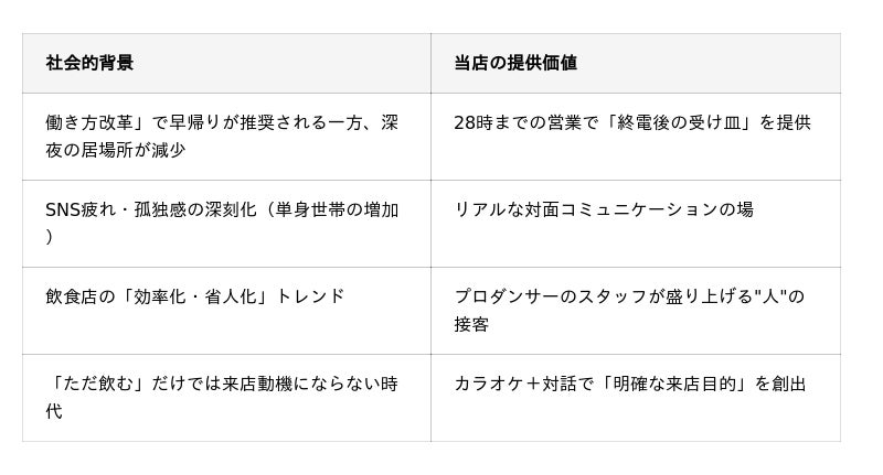 こうした業界の構造変化を逆手に取り、当店は「深夜営業延長」と「スナック業態への進化」という、業界の定説とは真逆の戦略に踏み切りました。