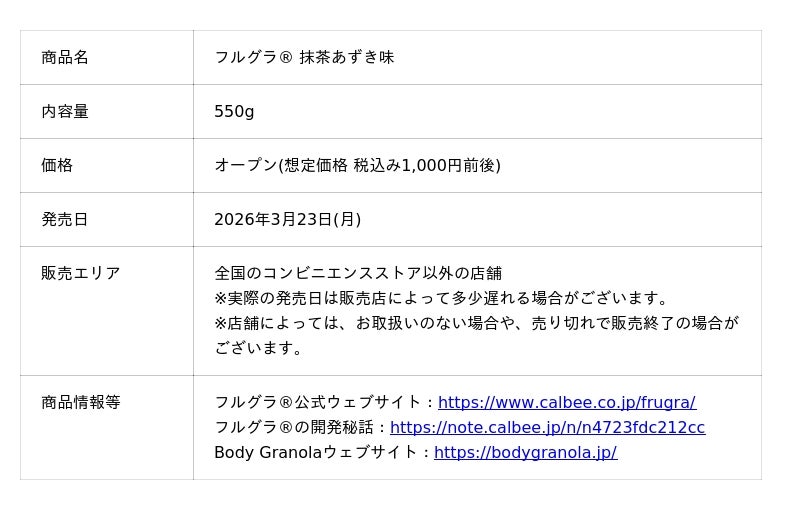 カルビー株式会社(本社:東京都千代田区、代表取締役社長兼CEO:江原 信)は、シリアルブランド売上No.1(※1)の「フルグラ(R)」より、和の味わいが楽しめる新商品『フルグラ(R) 抹茶あずき味』を2026年3月23日(月)から全国のコンビニエンスストア以外の店舗で期間限定発売します(2026年6月上旬終売予定)。