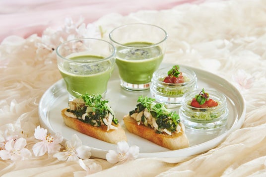 抹茶とカリフラワーのポタージュ/野沢菜漬けと鶏ハムのオープンサンド/抹茶とクスクスのタブレサラダ 漬けマグロ添え