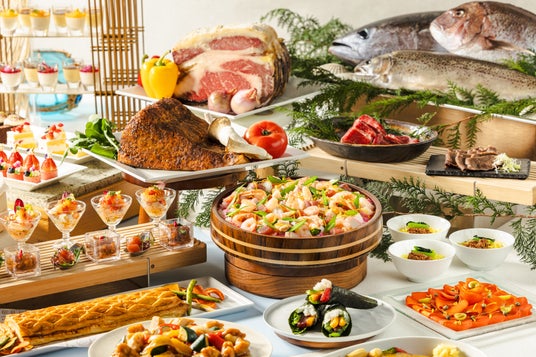 また、ローストビーフやカジキマグロのロースト、白身魚のパイ包み焼きを目の前で仕上げるカッティングサービスのほか、とろとろのラクレットチーズをかけて味わう料理や国産牛ロースの焼きしゃぶ、お好みの具材で作る手巻き寿司など、豊富なメニューをご用意しております。デザートコーナーには10種類以上のスイーツを取り揃え、キッズコーナーでは日替わりでハンバーグやエビフライ、端午の節句にちなんだ柏もちなどのお子さま向けメニューも充実。ご家族皆さまで心ゆくまで満喫いただけます。