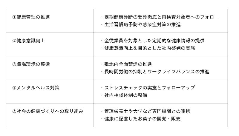 さらに、お菓子づくりの企業として、健康に配慮した商品づくりや食の提案を通じ、社員の健康だけでなく社会全体の健康づくりにも貢献する企業を目指しています。
