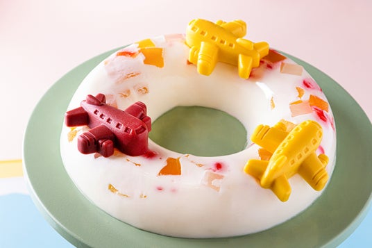 チェリーやパイナップルなどのキャンディフルーツをミルクババロアで包み飛行機を象ったチョコレートを添えました。