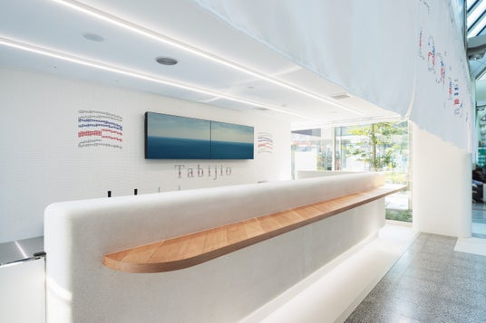 店舗デザインは、インテリアデザインスタジオ『COOPDESIGN Lab.(コープデザインラボ)』が担当しました。外観は塩釜をイメージしたファサード、店内は白を基調とした空間で塩の世界観を表現しています。左官仕上げのカウンターや木の素材を用いた空間に加え、店内中央にはデジタルサイネージを設置。愛媛の海のきらめきや島々の風景を映し出し、ゆったりとした時間を楽しめる空間を演出しています。
