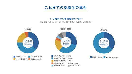 参加者の属性は、起業家、個人事業主、地域おこし協力隊、家業後継者、団体職員、都市部大企業・ベンチャー企業・地方の中小企業の会社員、自治体職員、研究者など多様。20-40代が70%以上。これまでに全国160市町村以上、そのうち61.7%が関東圏以外から参加しています。