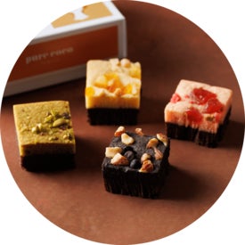 『ピュアココ トーキョー』の代表商品である「ピュアココ」の2フレーバーが楽しめるハットボックスと、グラッセしたオリーブをホワイトチョコレートでコーティングした「ピュアココ オリーブ」、ハイブリッドスイーツ「ブルッキー」の3種をセットにしたお得なセットです。