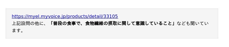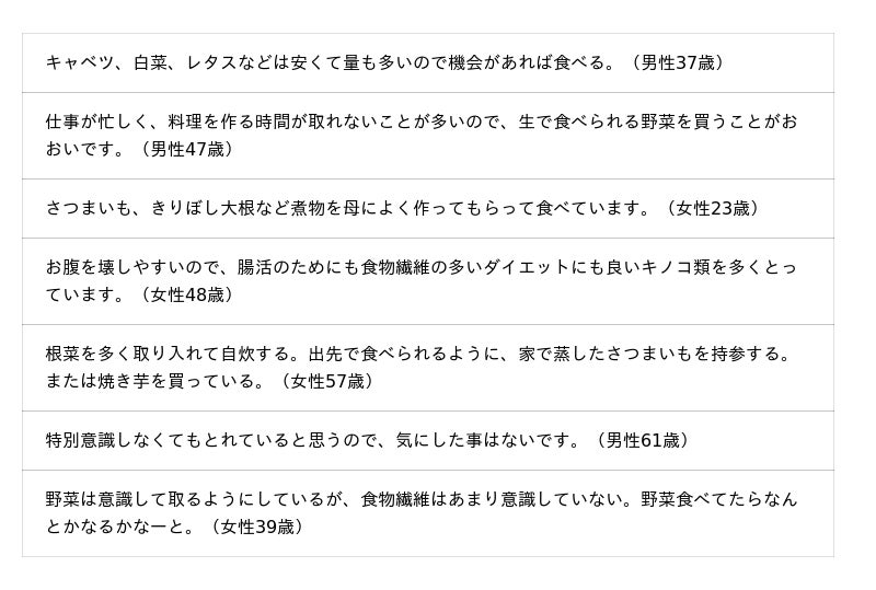 食物繊維の摂取状況や摂取理由、自由記述にて意識して行っていることなどについて聞いています。調査結果をお知らせいたします。