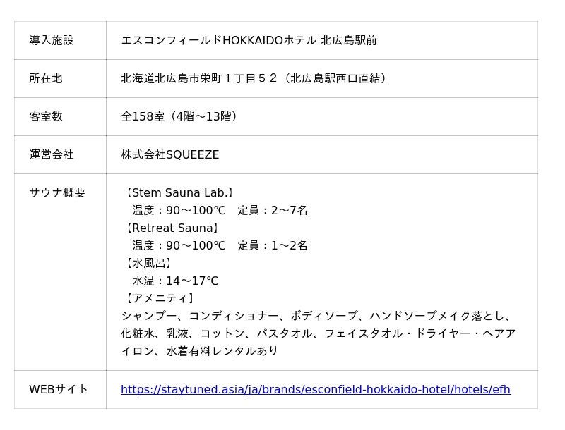 株式会社エスコン(本社:東京都港区、代表取締役社長:伊藤貴俊)は、革新的なファインバブル技術を持つ株式会社サイエンス(本社:大阪市淀川区、代表取締役社長:水上康洋、以下サイエンス)と、新たなサウナ体験とウェルビーイングの実現を目的に「エスコンフィールドHOKKAIDOホテル北広島駅前(以下、本ホテル)」のサウナ施設に、「ミライ人間洗濯機」を北海道で初めて導入することを決定しました。一般利用の開始は2026年3月31日(3月19日より予約受付)です。本日実施したお披露目会には、ゲストとしてサウナ好きで知られるロッチ コカドさん、ファイターズOBの斎藤佑樹さん、元ファイターズガールの滝谷美夢さんをお招きし、“ミライの入浴”について熱いトークを繰り広げていただきました。