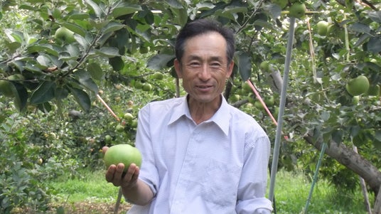 小布施町でブラムリーを栽培する(左から)荒井ゆり子氏、荒井正晴氏、荒井茂生氏