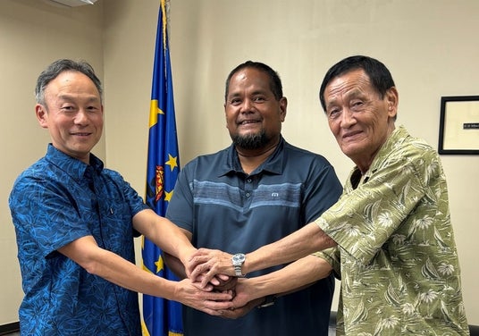 左から、Pacific Islands Development CorporationPresident 丹下慎也、Eyos Rudimchコロール州知事、パラオ共和国コロール州政府廃棄物コンサルタント 藤勝雄氏