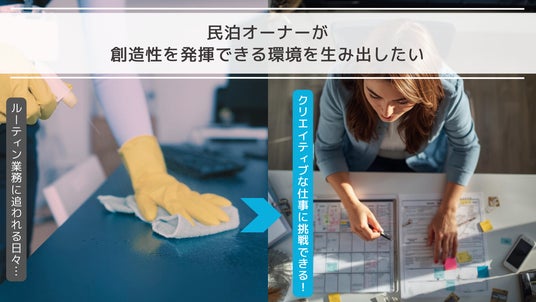 民泊運営には、コンセプト設計などの「クリエイティブな仕事」と、清掃などの「マニュアル化可能なルーティン業務」の二面性があります。現状、多くのオーナーが一人で何役もこなし、日々の業務に追われ、本来やりたかった創造性の発揮まで手が回らない状況を我々は多くの場面で目にしてきました。当社は、オーナーの思いが煩雑な作業によって削がれてしまうことは、地域観光にとって大きな損失であると考え、この現状を打破したいと考えています。