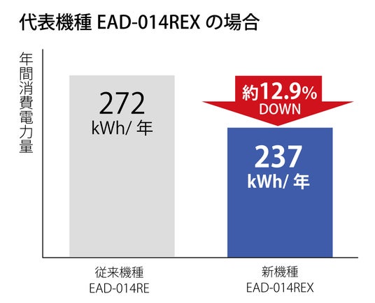 圧縮機や凝縮器ファンモーター変更等により、従来機種より年間消費電力量ダウン。