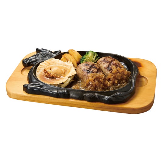 粗挽きのビーフを100%使用したジューシーな“大俵ハンバーグ”と、北海道産のホタテを一緒にご堪能いただける一品です。ホタテはバター醤油で香ばしく焼き上げ、濃厚な旨みとプリプリとした食感を楽しめるように仕上げています。肉と魚介のどちらも楽しめる満足感のあるメニューです。